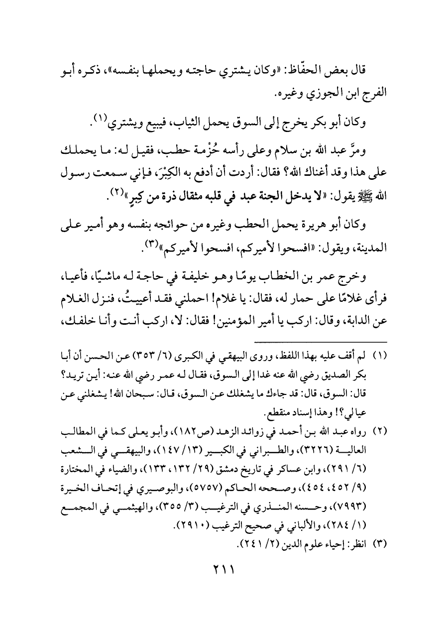 ومرَّ عبد الله بن سلام وعلى رأسه حُزْمة حطب، فقيل له: ما يحملك على هذا وقد أغناك الله؟ فقال: أردت أن أدفع به الكِبْرَ، فإني سمعت رسول الله - صلى الله عليه وسلم - يقول: «لا يدخل الجنة عبد في قلبه مثقال ذرة من كِبرٍ» (¬٢).
