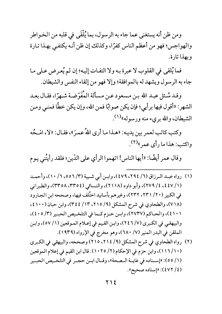 (¬٢) رواه الطحاوي في شرح المشكل (٩/ ٢١٤، ٢١٥) وصححه، والبيهقي في الكبرى (١٠/ ١١٦)، وابن حزم في الإحكام (٢/ ١٠٢٥). قال ابن القيم في إعلام الموقعين (١/ ٥٥): «إسناده في غاية الصحة»، وقال ابن حجر في التلخيص الحبير (٤/ ٤٧٢): «إسناده صحيح».