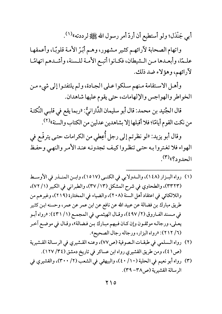 قال الجُنيد بن محمد: قال أبو سليمان الدَّارانيُّ: «ربما يقع في قلبي النُكتة من نكت القوم أيامًا؛ فلا أقبلها إلا بشاهدين عدلين من الكتاب والسنة» (¬٢).