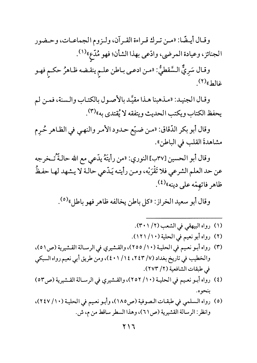 (¬٣) رواه أبو نعيم في الحلية (١٠/ ٢٥٥)، والقشيري في الرسالة القشيرية (ص ٥١)، والخطيب في تاريخ بغداد (٧/ ٢٤٣، ١٤/ ٤٠١)، ومن طريق أبي نعيم رواه السبكي في طبقات الشافعية (٢/ ٢٧٣).
