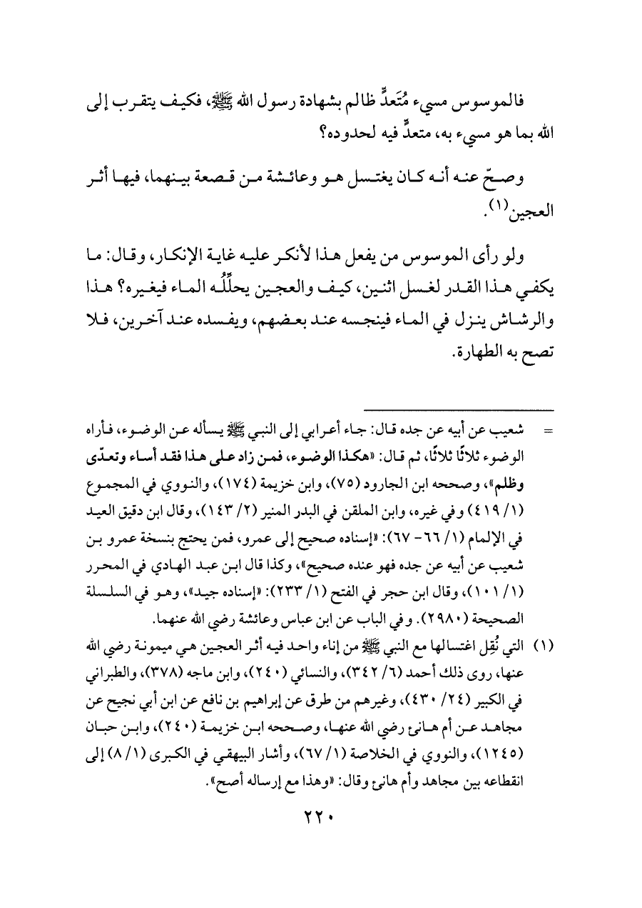 ولو رأى الموسوس من يفعل هذا لأنكر عليه غاية الإنكار، وقال: ما يكفي هذا القدر لغسل اثنين، كيف والعجين يحلِّلُه الماء فيغيره؟ هذا والرشاش ينزل في الماء فينجسه عند بعضهم، ويفسده عند آخرين، فلا تصح به الطهارة.