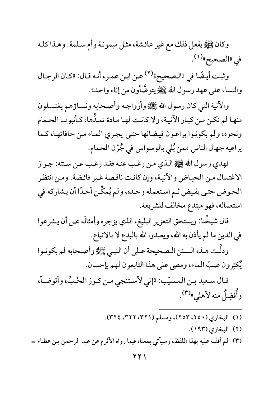 فهدي رسول الله - صلى الله عليه وسلم - الذي من رغب عنه فقد رغب عن سنته: جواز الاغتسال من الحياض والآنية، وإن كانت ناقصة غير فائضة. ومن انتظر الحوض حتى يفيض ثم استعمله وحده، ولم يُمكِّن أحدًا أن يشاركه في استعماله، فهو مبتدع مخالف للشريعة.