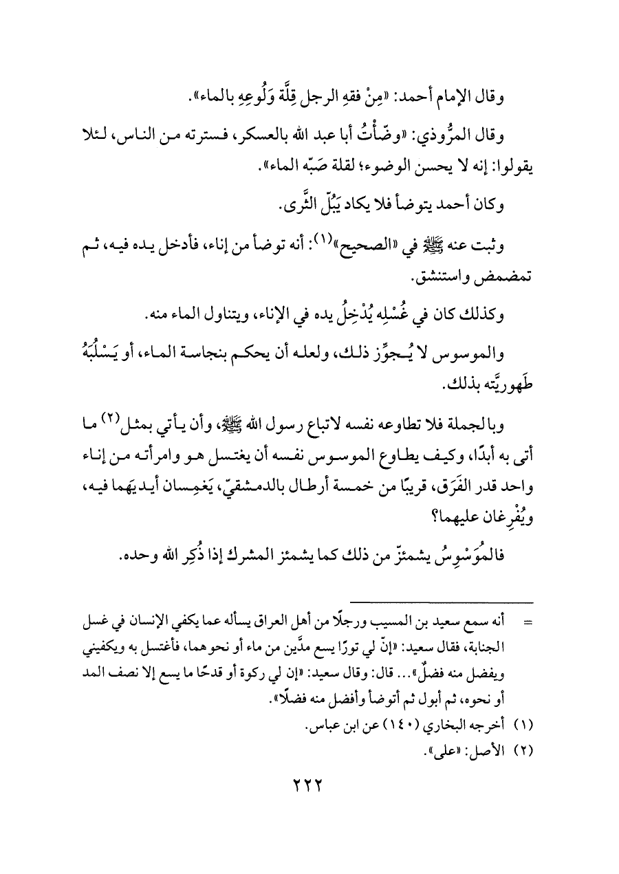 وقال الإمام أحمد: «مِنْ فقهِ الرجل قِلَّة وَلُوعِهِ بالماء».