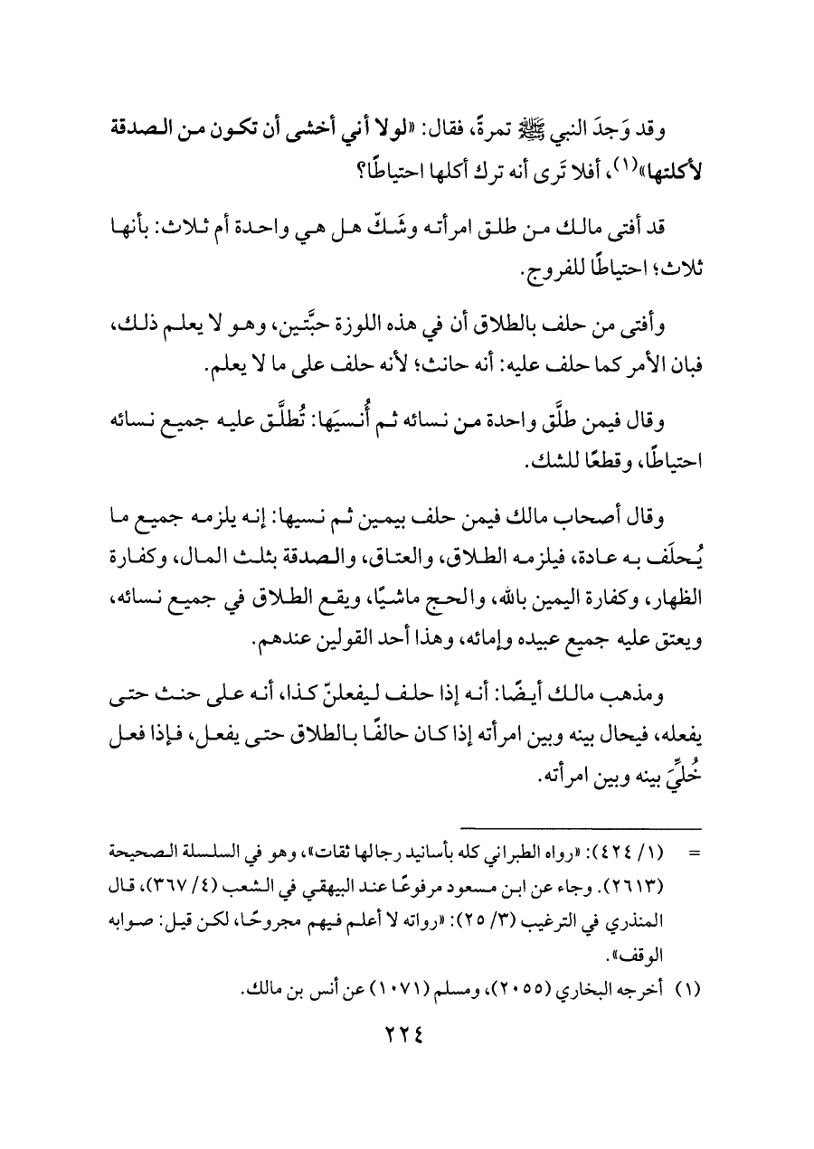 وقد وَجدَ النبي - صلى الله عليه وسلم - تمرةً، فقال: «لولا أني أخشى أن تكون من الصدقة لأكلتها» (¬١)، أفلا تَرى أنه ترك أكلها احتياطًا؟