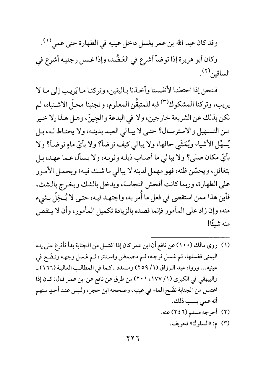فنحن إذا احتطنا لأنفسنا وأخذنا باليقين، وتركنا ما يَريب إلى ما لا يريب، وتركنا المشكوك (¬٣) فيه للمتيقَّن المعلوم، وتجنبنا محلّ الاشتباه، لم نكن بذلك عن الشريعة خارجين، ولا في البدعة والجِينَ، وهل هذا إلا خير من التسهيل والاسترسال؟ حتى لا يبالي العبد بدينه، ولا يحتاط له، بل يُسهِّل الأشياء ويُمَشّي حالها، ولا يبالي كيف توضأ؟ ولا بأيّ ماءٍ توضأ؟ ولا بأيّ مكان صلى؟ ولا يبالي ما أصاب ذيله وثوبه، ولا يسأل عما عهد، بل يتغافل، ويحسّن ظنه، فهو مهمل لدينه لا يبالي ما شك فيه؛ ويحمل الأمور على الطهارة، وربما كانت أفحش النجاسة، ويدخل بالشك ويخرج بالشك، فأين هذا ممن استقصى في فعل ما أُمر به، واجتهد فيه، حتى لا يُخِلّ بشيء منه، وإن زاد على المأمور فإنما قصده بالزيادة تكميل المأمور، وأن لا ينقص منه شيئًا!
