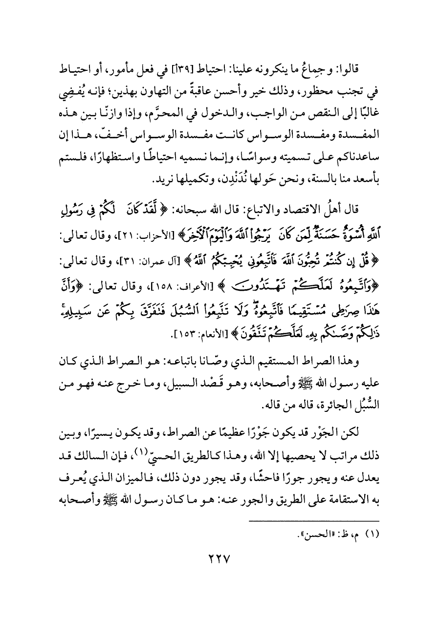 قال أهلُ الاقتصاد والاتباع: قال الله سبحانه: {لَقَدْ كَانَ لَكُمْ فِي رَسُولِ اللَّهِ أُسْوَةٌ حَسَنَةٌ لِمَنْ كَانَ يَرْجُو اللَّهَ وَالْيَوْمَ الْآخِرَ} [الأحزاب: ٢١]، وقال تعالى: {قُلْ إِنْ كُنْتُمْ تُحِبُّونَ اللَّهَ فَاتَّبِعُونِي يُحْبِبْكُمُ اللَّهُ} [آل عمران: ٣١]، وقال تعالى: {وَاتَّبِعُوهُ لَعَلَّكُمْ تَهْتَدُونَ} [الأعراف: ١٥٨]، وقال تعالى: {وَأَنَّ هَذَا صِرَاطِي مُسْتَقِيمًا فَاتَّبِعُوهُ وَلَا تَتَّبِعُوا السُّبُلَ فَتَفَرَّقَ بِكُمْ عَنْ سَبِيلِهِ ذَلِكُمْ وَصَّاكُمْ بِهِ لَعَلَّكُمْ تَتَّقُونَ} [الأنعام: ١٥٣].