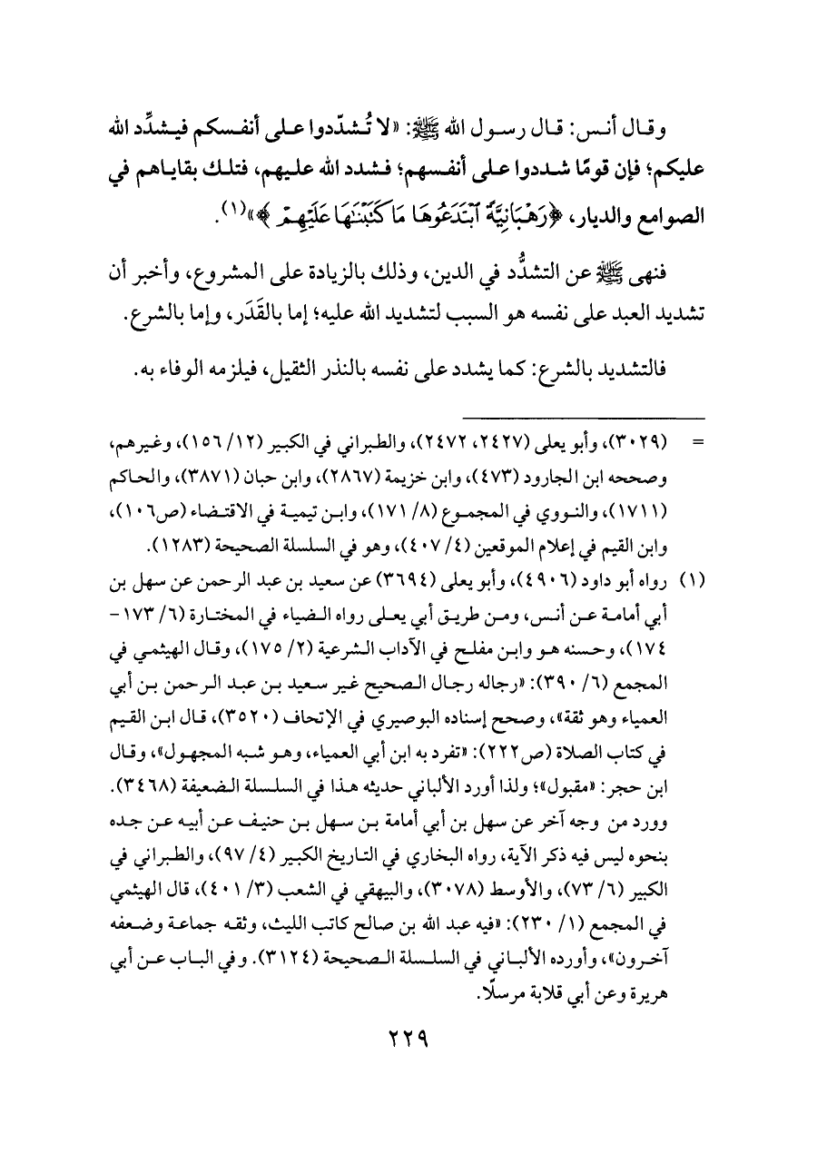 وقال أنس: قال رسول الله - صلى الله عليه وسلم -: «لا تُشدّدوا على أنفسكم فيشدِّد الله عليكم؛ فإن قومًا شددوا على أنفسهم؛ فشدد الله عليهم، فتلك بقاياهم في الصوامع والديار، {رَهْبَانِيَّةً ... ابْتَدَعُوهَا مَا كَتَبْنَاهَا عَلَيْهِمْ}» (¬١).