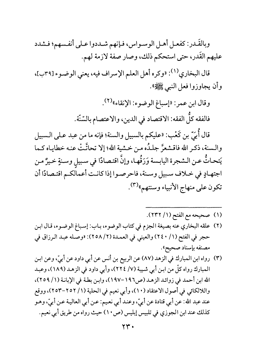 قال البخاري (¬١): «وكره أهل العلم الإسراف فيه، يعني الوضوء [٣٩ ب]، وأن يجاوزوا فعل النبي - صلى الله عليه وسلم -».