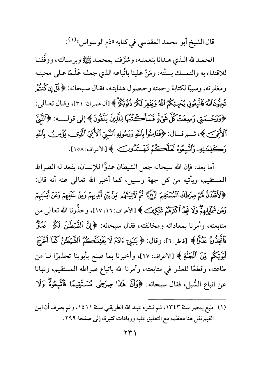 قال الشيخ أبو محمد المقدسي في كتابه «ذم الوسواس» (¬١):