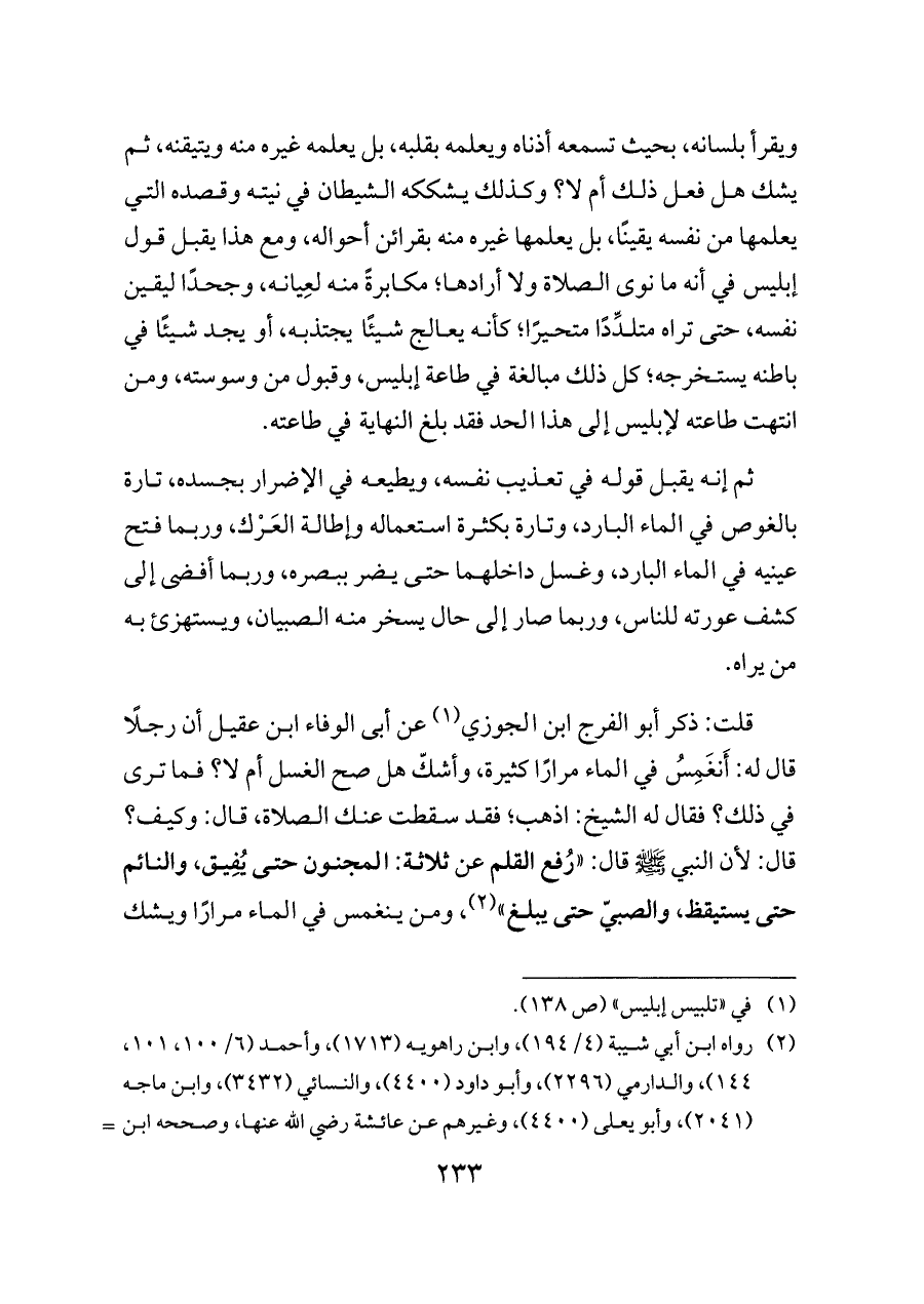 قلت: ذكر أبو الفرج ابن الجوزي (¬١) عن أبى الوفاء ابن عقيل أن رجلًا قال له: أَنغَمِسُ في الماء مرارًا كثيرة، وأشكّ هل صح الغسل أم لا؟ فما ترى في ذلك؟ فقال له الشيخ: اذهب؛ فقد سقطت عنك الصلاة، قال: وكيف؟ قال: لأن النبي - صلى الله عليه وسلم - قال: «رُفع القلم عن ثلاثة: المجنون حتى يُفِيق، والنائم حتى يستيقظ، والصبيّ حتى يبلغ» (¬٢)، ومن ينغمس في الماء مرارًا ويشك