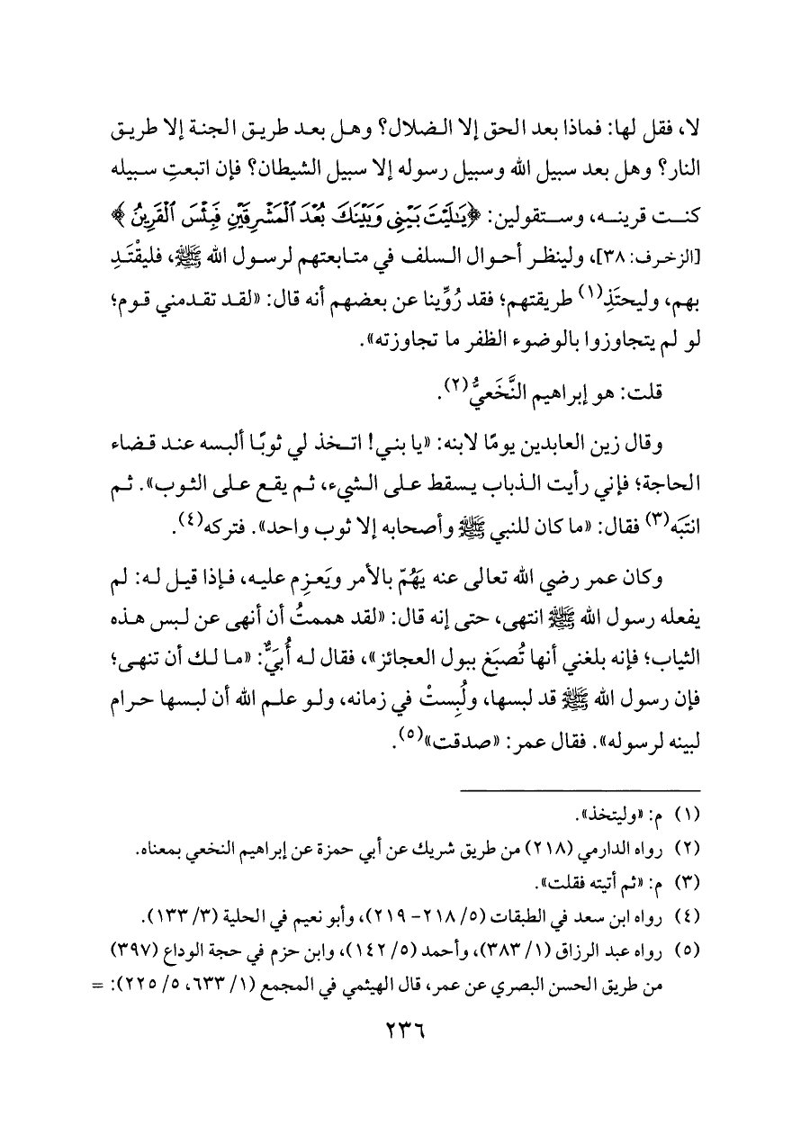 (¬٥) رواه عبد الرزاق (١/ ٣٨٣)، وأحمد (٥/ ١٤٢)، وابن حزم في حجة الوداع (٣٩٧) من طريق الحسن البصري عن عمر، قال الهيثمي في المجمع (١/ ٦٣٣، ٥/ ٢٢٥): «رجاله رجال الصحيح، إلا أن الحسن لم يسمع من عمر ولا من أُبيّ». ورواه ابن أبي عاصم في كتاب اللباس ـ كما في فتح الباري لابن رجب (٢/ ١٦١) ـ من طريق قبيصة بن جابر عن عمر، وفيه أن الرجل المعترض هو عبد الرحمن بن عوف. ورواه عبد الرزاق (١/ ٣٨٢) عن معمر عن قتادة عن عمر، ولم يسمّ الرجل المعترضَ. ورواه عبد الرزاق أيضًا (١/ ٣٨٣)، وأبو بكر الخلال ـ كما في فتح الباري لابن رجب (٢/ ١٦١) ـ من طريق ابن سيرين قال: همّ عمر أن ينهى عن ثياب حبرة لصبغ البول ثم قال: «كان نُهينا عن التعمّق».