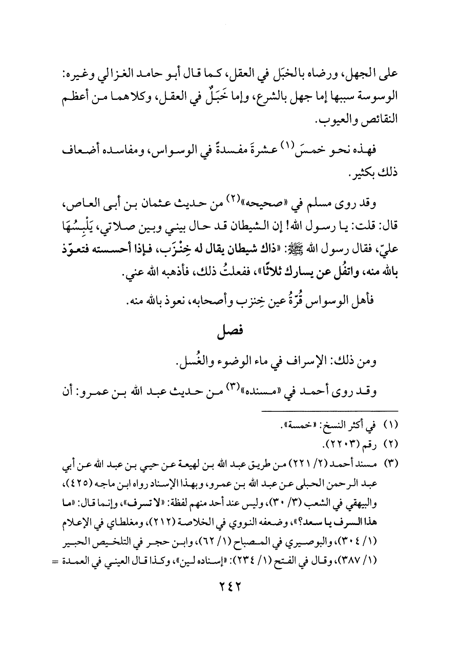 (¬٣) مسند أحمد (٢/ ٢٢١) من طريق عبد الله بن لهيعة عن حيي بن عبد الله عن أبي عبد الرحمن الحبلى عن عبد الله بن عمرو، وبهذا الإسناد رواه ابن ماجه (٤٢٥)، والبيهقي في الشعب (٣/ ٣٠)، وليس عند أحد منهم لفظة: «لا تسرف»، وإنما قال: «ما هذا السرف يا سعد؟»، وضعفه النووي في الخلاصة (٢١٢)، ومغلطاي في الإعلام (١/ ٣٠٤)، والبوصيري في المصباح (١/ ٦٢)، وابن حجر في التلخيص الحبير (١/ ٣٨٧)، وقال في الفتح (١/ ٢٣٤): «إسناده لين»، وكذا قال العيني في العمدة (٢/ ٢٤٣)، وحسّن إسناده علي القاري في المرقاة (٢/ ١٢٢)، والألباني في السلسلة الصحيحة (٣٢٩٢). وفي الباب عن ابن عمر وأبي سلام وعن الزهري مرسلًا.