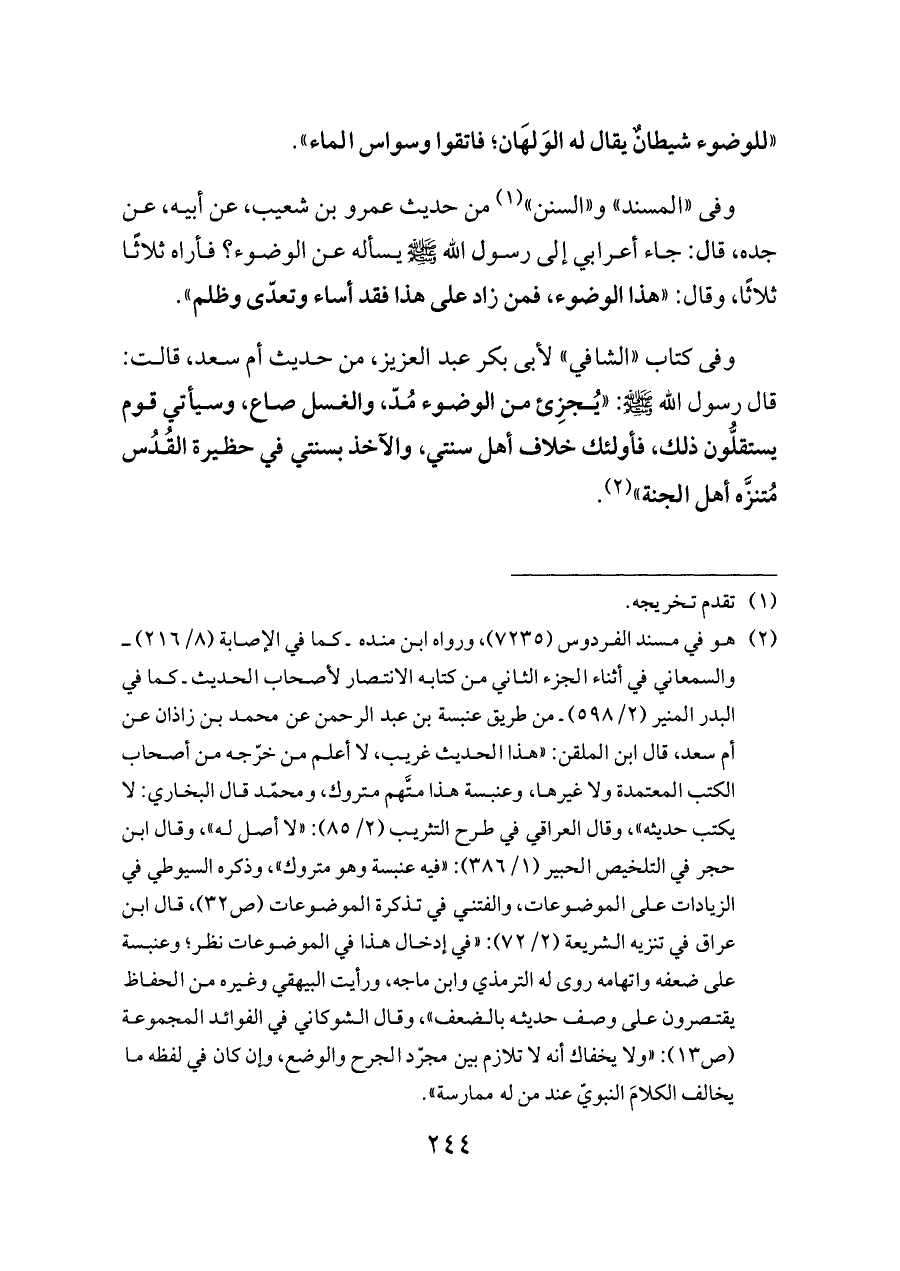 وفى كتاب «الشافي» لأبى بكر عبد العزيز، من حديث أم سعد، قالت: قال رسول الله - صلى الله عليه وسلم -: «يُجزِئ من الوضوء مُدّ، والغسل صاع، وسيأتي قوم يستقلُّون ذلك، فأولئك خلاف أهل سنتي، والآخذ بسنتي في حظيرة القُدُس مُتنزَّه أهل الجنة» (¬٢).