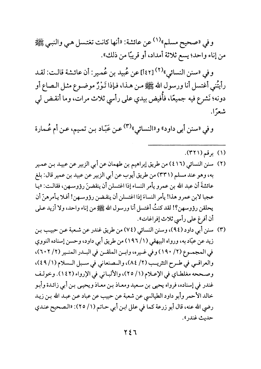(¬٢) سنن النسائي (٤١٦) من طريق إبراهيم بن طهمان عن أبي الزبير عن عبيد بن عمير به، وهو عند مسلم (٣٣١) من طريق أيوب عن أبي الزبير عن عبيد بن عمير قال: بلغ عائشةَ أن عبد الله بن عمرو يأمر النساء إذا اغتسلن أن ينقضنَ رؤوسهن، فقالت: «يا عجبا لابن عمرو هذا! يأمر النساءَ إذا اغتسلن أن ينقضن رؤوسهن! أفلا يأمرهنّ أن يحلقن رؤوسهن؟! لقد كنتُ أغتسل أنا ورسول الله -صلى الله عليه وسلم- من إناء واحد، ولا أزيد على أن أفرغ على رأسي ثلاث إفراغات».
