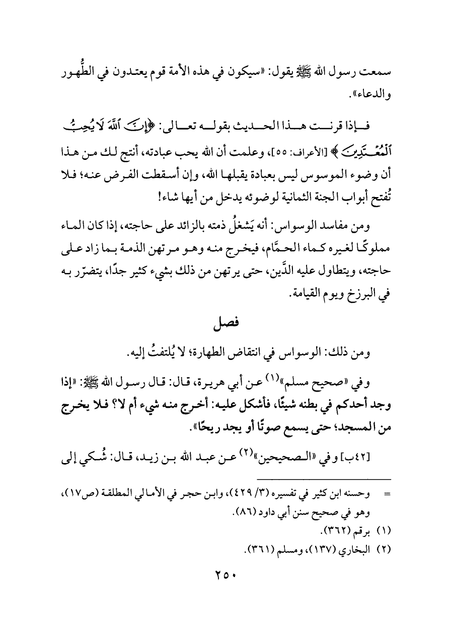ومن مفاسد الوسواس: أنه يَشغلُ ذمته بالزائد على حاجته، إذا كان الماء مملوكًا لغيره كماء الحمَّام، فيخرج منه وهو مرتهن الذمة بما زاد على حاجته، ويتطاول عليه الدَّين، حتى يرتهن من ذلك بشيء كثير جدًا، يتضرّر به في البرزخ ويوم القيامة.