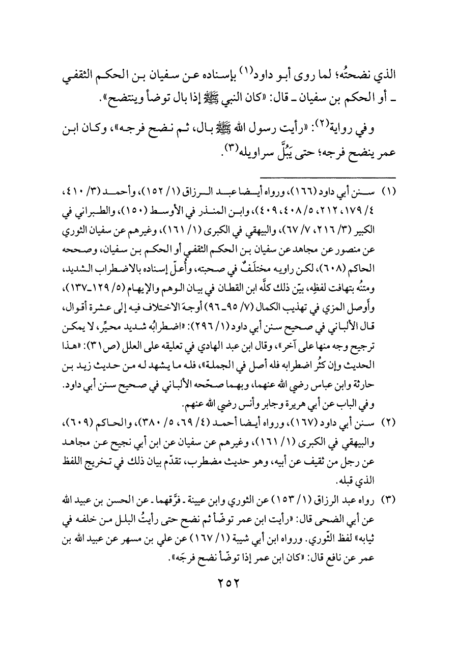 (¬٣) رواه عبد الرزاق (١/ ١٥٣) عن الثوري وابن عيينة ـ فرَّقهما ـ عن الحسن بن عبيد الله عن أبي الضحى قال: «رأيت ابن عمر توضّأ ثم نضح حتى رأيتُ البلل من خلفه في ثيابه» لفظ الثّوري. ورواه ابن أبي شيبة (١/ ١٦٧) عن علي بن مسهر عن عبيد الله بن عمر عن نافع قال: «كان ابن عمر إذا توضّأ نضح فرجَه».