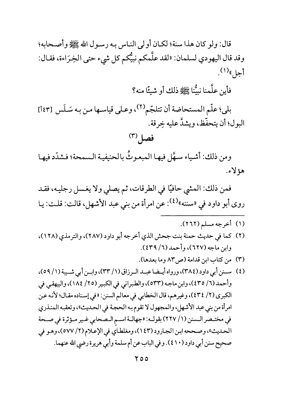(¬٤) سنن أبي داود (٣٨٤)، ورواه أيضا عبد الرزاق (١/ ٣٣)، وابن أبي شيبة (١/ ٥٩)، وأحمد (٦/ ٤٣٥)، وابن ماجه (٥٣٣)، والطبراني في الكبير (٢٥/ ١٨٤)، والبيهقي في الكبرى (٢/ ٤٣٤)، وغيرهم، قال الخطابي في معالم السنن: «في إسناده مقال؛ لأنه عن امرأة من بني عبد الأشهل، والمجهول لا تقوم به الحجة في الحديث»، وتعقبه المنذري في مختصر السنن (١/ ٢٢٧) بقوله: «جهالة اسمِ الصحابي غير مؤثرة في صحة الحديث»، وصححه ابن الجارود (١٤٣)، ومغلطاي في الإعلام (٢/ ٥٧٧)، وهو في صحيح سنن أبي داود (٤١٠). وفي الباب عن أم سلمة وأبي هريرة رضي الله عنهما.
