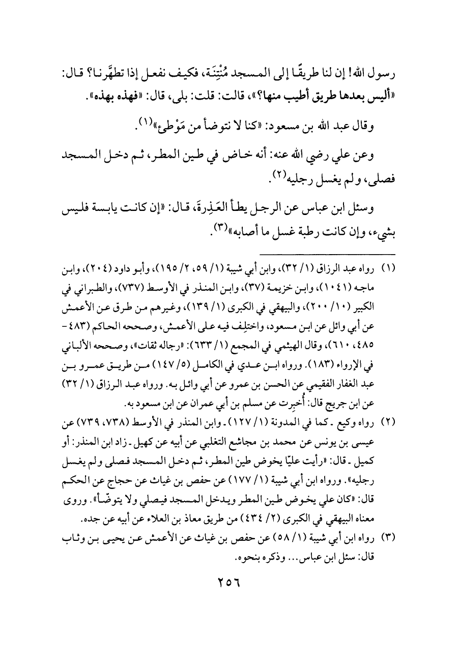 (¬٢) رواه وكيع ـ كما في المدونة (١/ ١٢٧) ـ وابن المنذر في الأوسط (٧٣٨، ٧٣٩) عن عيسى بن يونس عن محمد بن مجاشع التغلبي عن أبيه عن كهيل ـ زاد ابن المنذر: أو كميل ـ قال: «رأيت عليّا يخوض طين المطر، ثم دخل المسجد فصلى ولم يغسل رجليه». ورواه ابن أبي شيبة (١/ ١٧٧) عن حفص بن غياث عن حجاج عن الحكم قال: «كان علي يخوض طين المطر ويدخل المسجد فيصلي ولا يتوضّأ». وروى معناه البيهقي في الكبرى (٢/ ٤٣٤) من طريق معاذ بن العلاء عن أبيه عن جده.