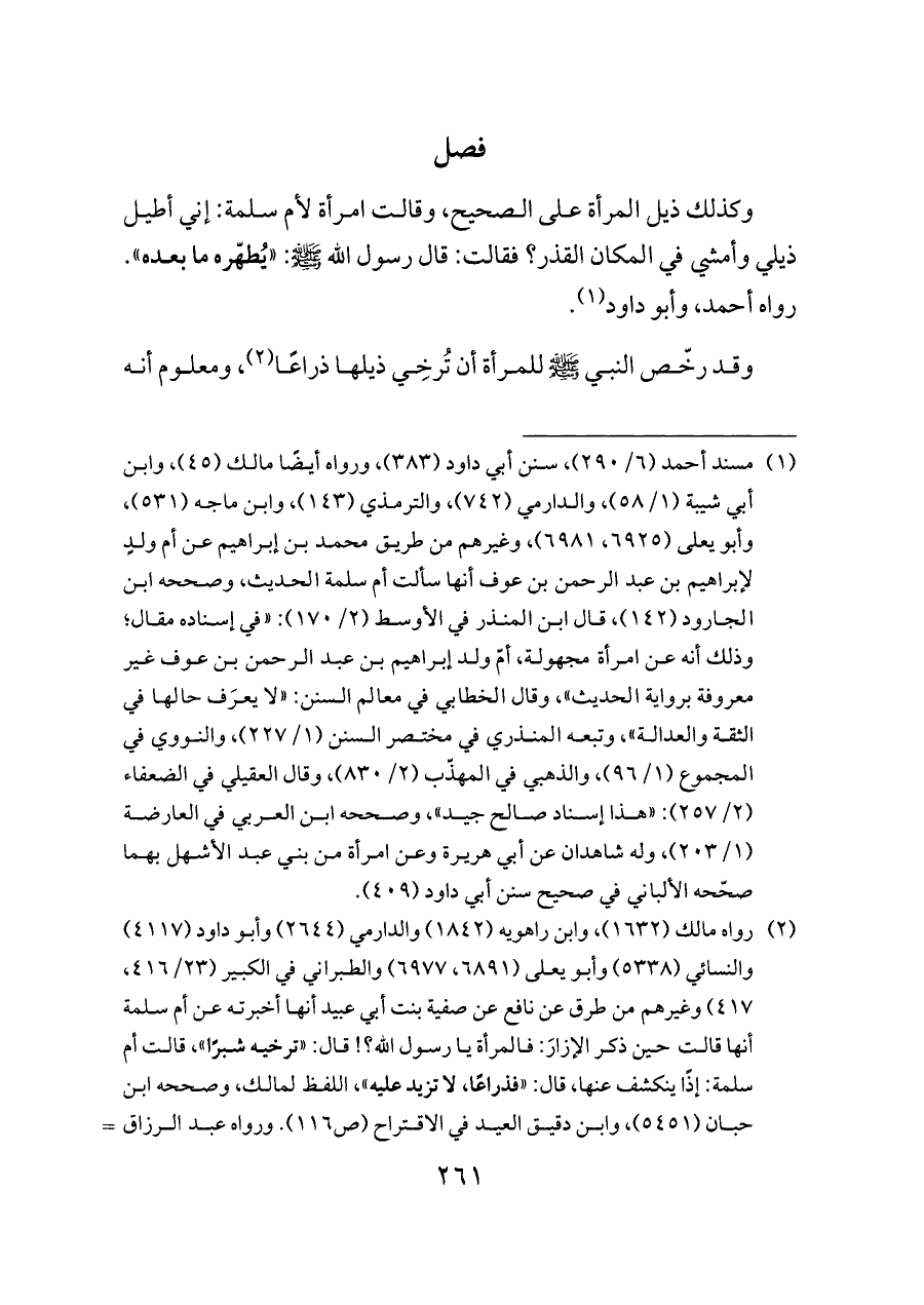 (¬١) مسند أحمد (٦/ ٢٩٠)، سنن أبي داود (٣٨٣)، ورواه أيضًا مالك (٤٥)، وابن أبي شيبة (١/ ٥٨)، والدارمي (٧٤٢)، والترمذي (١٤٣)، وابن ماجه (٥٣١)، وأبو يعلى (٦٩٢٥، ٦٩٨١)، وغيرهم من طريق محمد بن إبراهيم عن أم ولدٍ لإبراهيم بن عبد الرحمن بن عوف أنها سألت أم سلمة الحديث، وصححه ابن الجارود (١٤٢)، قال ابن المنذر في الأوسط (٢/ ١٧٠): «في إسناده مقال؛ وذلك أنه عن امرأة مجهولة، أمّ ولد إبراهيم بن عبد الرحمن بن عوف غير معروفة برواية الحديث»، وقال الخطابي في معالم السنن: «لا يعرَف حالها في الثقة والعدالة»، وتبعه المنذري في مختصر السنن (١/ ٢٢٧)، والنووي في المجموع (١/ ٩٦)، والذهبي في المهذّب (٢/ ٨٣٠)، وقال العقيلي في الضعفاء (٢/ ٢٥٧): «هذا إسناد صالح جيد»، وصححه ابن العربي في العارضة (١/ ٢٠٣)، وله شاهدان عن أبي هريرة وعن امرأة من بني عبد الأشهل بهما صحّحه الألباني في صحيح سنن أبي داود (٤٠٩).