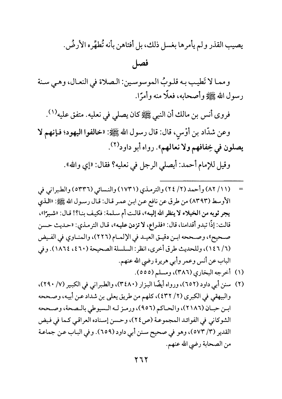 وعن شدّاد بن أوْسٍ، قال: قال رسول الله - صلى الله عليه وسلم -: «خالفوا اليهود؛ فإنهم لا يصلون في خِفافهم ولا نعالهم». رواه أبو داود (¬٢).