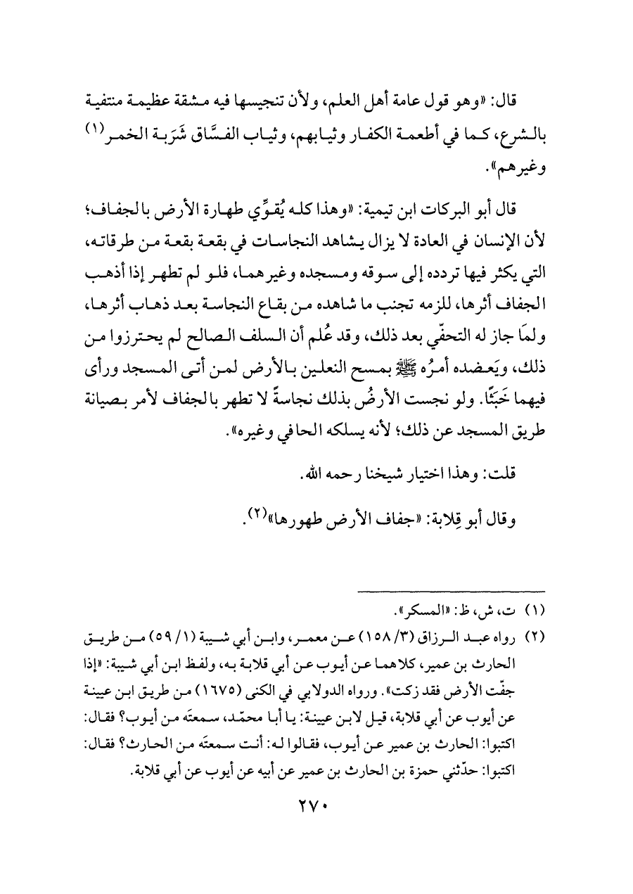 قال أبو البركات ابن تيمية: «وهذا كله يُقوِّي طهارة الأرض بالجفاف؛ لأن الإنسان في العادة لا يزال يشاهد النجاسات في بقعة بقعة من طرقاته، التي يكثر فيها تردده إلى سوقه ومسجده وغيرهما، فلو لم تطهر إذا أذهب الجفاف أثرها، للزمه تجنب ما شاهده من بقاع النجاسة بعد ذهاب أثرها، ولَمَا جاز له التحفّي بعد ذلك، وقد عُلم أن السلف الصالح لم يحترزوا من ذلك، ويَعضده أمرُه - صلى الله عليه وسلم - بمسح النعلين بالأرض لمن أتى المسجد ورأى فيهما خَبَثًا. ولو نجست الأرضُ بذلك نجاسةً لا تطهر بالجفاف لأمر بصيانة طريق المسجد عن ذلك؛ لأنه يسلكه الحافي وغيره».