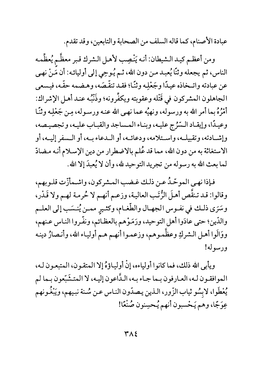 ومن أعظم كيد الشيطان: أنه يَنْصِب لأهل الشرك قبر معظَّمٍ يُعظِّمه الناس، ثم يجعله وثنًا يُعبد من دون الله، ثم يُوحِي إلى أوليائه: أن مَنْ نهى عن عبادته واتخاذه عيدًا وجَعْلِه وثنًا؛ فقد تنقّصَه، وهضمه حقّه، فيسعى الجاهلون المشركون في قَتْله وعقوبته ويكفِّرونه؛ وذَنْبُه عند أهل الإشراك: أمْرُهُ بما أمر الله به ورسوله، ونهيُه عما نهى الله عنه ورسوله، مِن جَعْلِه وثنًا وعيدًا، وإيقاد السّرُج عليه، وبناء المساجد والقباب عليه، وتجصيصه، وإشادته، وتقبيله، واستلامه، ودعائه، أو الدعاء به، أو السفر إليه، أو الاستغاثة به من دون الله، مما قد عُلم بالاضطرار من دين الإسلام أنه مضادّ لما بعث الله به رسوله من تجريد التوحيد لله، وأن لا يُعبدَ إلا الله.