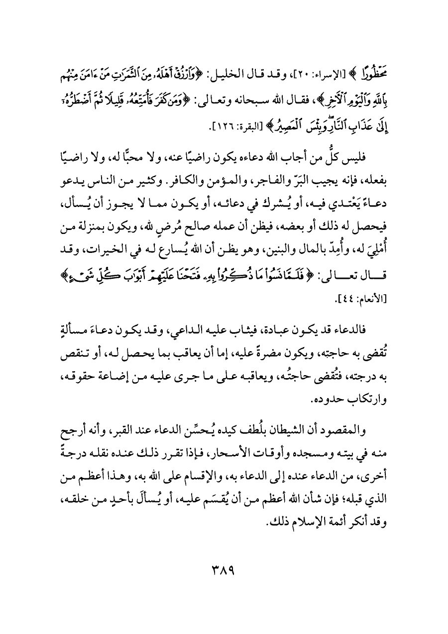 فليس كلُّ من أجاب الله دعاءه يكون راضيًا عنه، ولا محبًّا له، ولا راضيًا بفعله، فإنه يجيب البَرّ والفاجر، والمؤمن والكافر. وكثير من الناس يدعو دعاءً يَعْتدي فيه، أو يُشرك في دعائه، أو يكون مما لا يجوز أن يُسأل، فيحصل له ذلك أو بعضه، فيظن أن عمله صالح مُرضٍ لله، ويكون بمنزلة من أُمْلِيَ له، وأُمِدّ بالمال والبنين، وهو يظن أن الله يُسارع له في الخيرات، وقد قال تعالى: {فَلَمَّا نَسُوا مَا ذُكِّرُوا بِهِ فَتَحْنَا عَلَيْهِمْ أَبْوَابَ كُلِّ شَيْءٍ} [الأنعام: ٤٤].