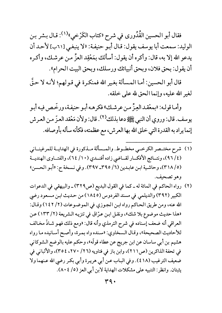 فقال أبو الحسين القُدُورى في شرح «كتاب الكَرْخي» (¬١): قال بشر بن الوليد: سمعت أبا يوسف يقول: قال أبو حنيفة: «لا ينبغي [٦١ ب] لأحد أن يدعو الله إلا به، قال: وأكره أن يقول: أسألك بمَعْقِد العزِّ من عرشك، وأكره أن يقول: بحق فلان، وبحق أنبيائك ورسلك، وبحق البيت الحرام».