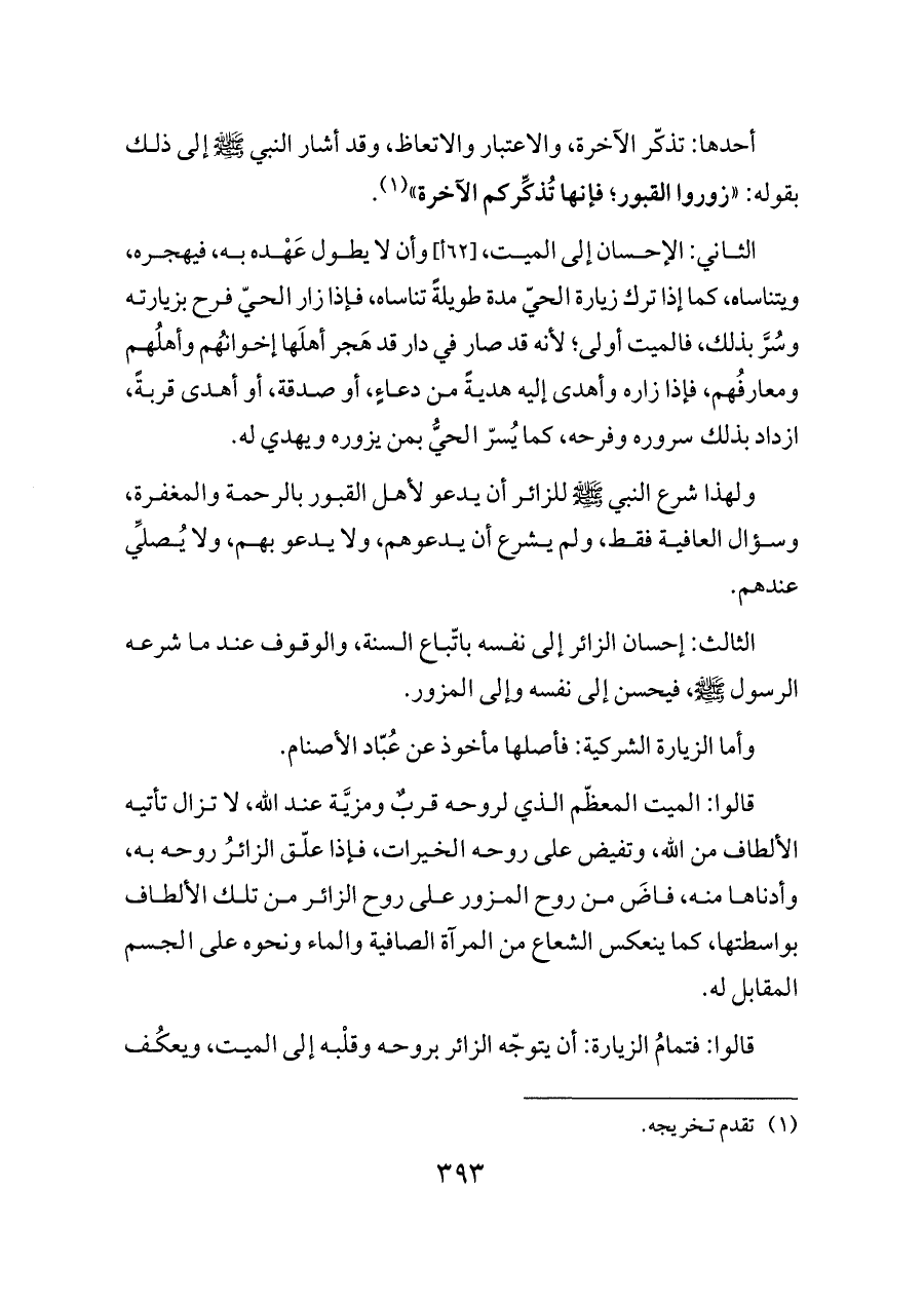أحدها: تذكّر الآخرة، والاعتبار والاتعاظ، وقد أشار النبي - صلى الله عليه وسلم - إلى ذلك بقوله: «زوروا القبور؛ فإنها تُذكِّركم الآخرة» (¬١).
