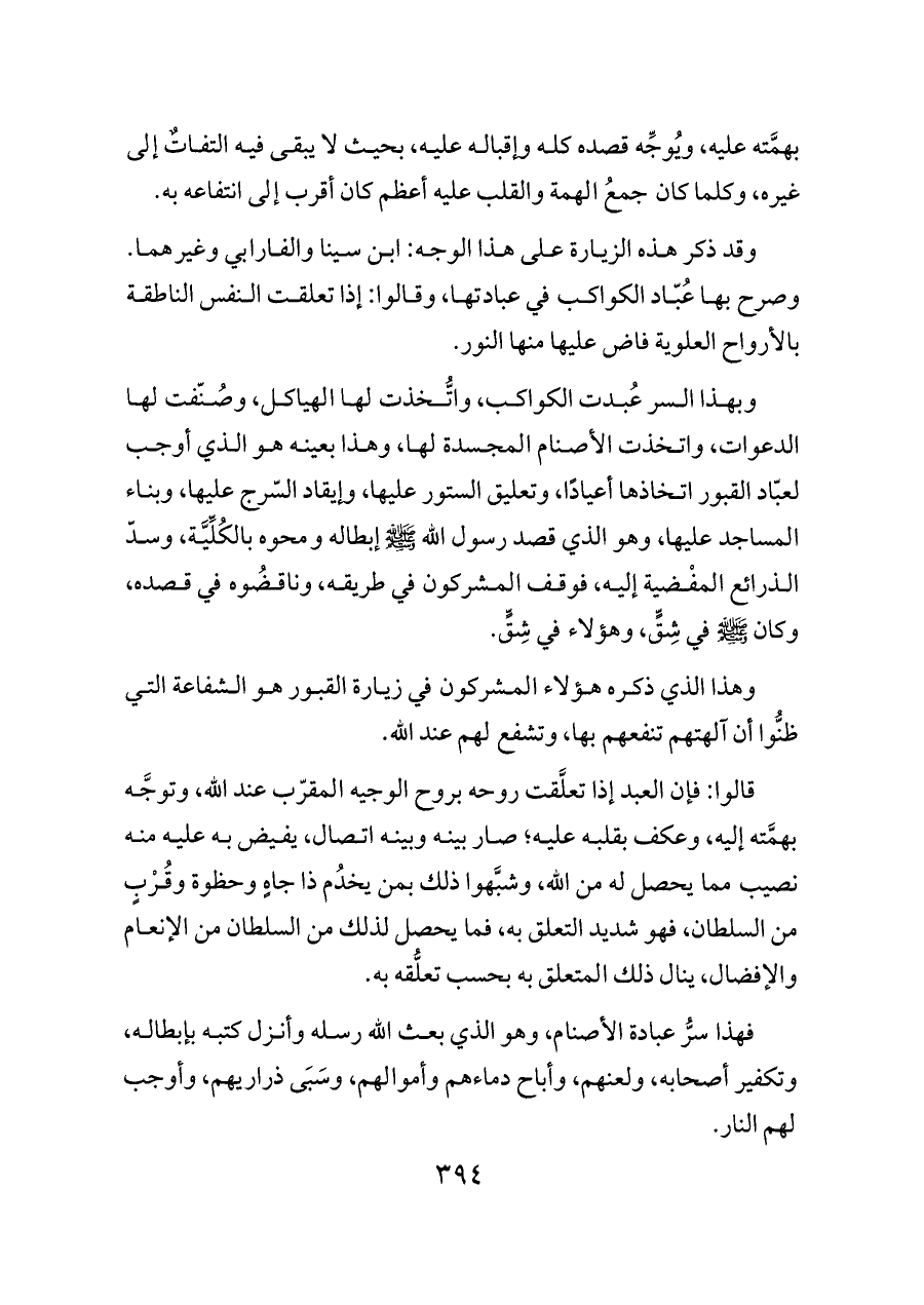 وبهذا السر عُبدت الكواكب، واتُّخذت لها الهياكل، وصُنّفت لها الدعوات، واتخذت الأصنام المجسدة لها، وهذا بعينه هو الذي أوجب لعبّاد القبور اتخاذها أعيادًا، وتعليق الستور عليها، وإيقاد السّرج عليها، وبناء المساجد عليها، وهو الذي قصد رسول الله - صلى الله عليه وسلم - إبطاله ومحوه بالكُلِّيَّة، وسدّ الذرائع المفْضية إليه، فوقف المشركون في طريقه، وناقضُوه في قصده، وكان - صلى الله عليه وسلم - في شِقٍّ، وهؤلاء في شِقٍّ.