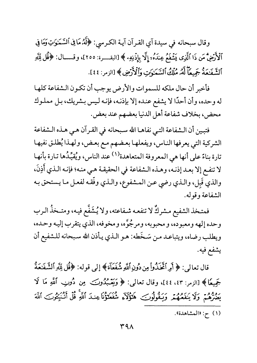 قال تعالى: {أَمِ اتَّخَذُوا مِنْ دُونِ اللَّهِ شُفَعَاءَ} إلى قوله: {قُلْ لِلَّهِ الشَّفَاعَةُ جَمِيعًا} [الزمر: ٤٣، ٤٤]، وقال تعالى: {وَيَعْبُدُونَ مِنْ دُونِ اللَّهِ مَا لَا يَضُرُّهُمْ وَلَا يَنْفَعُهُمْ وَيَقُولُونَ هَؤُلَاءِ شُفَعَاؤُنَا عِنْدَ اللَّهِ قُلْ أَتُنَبِّئُونَ اللَّهَ