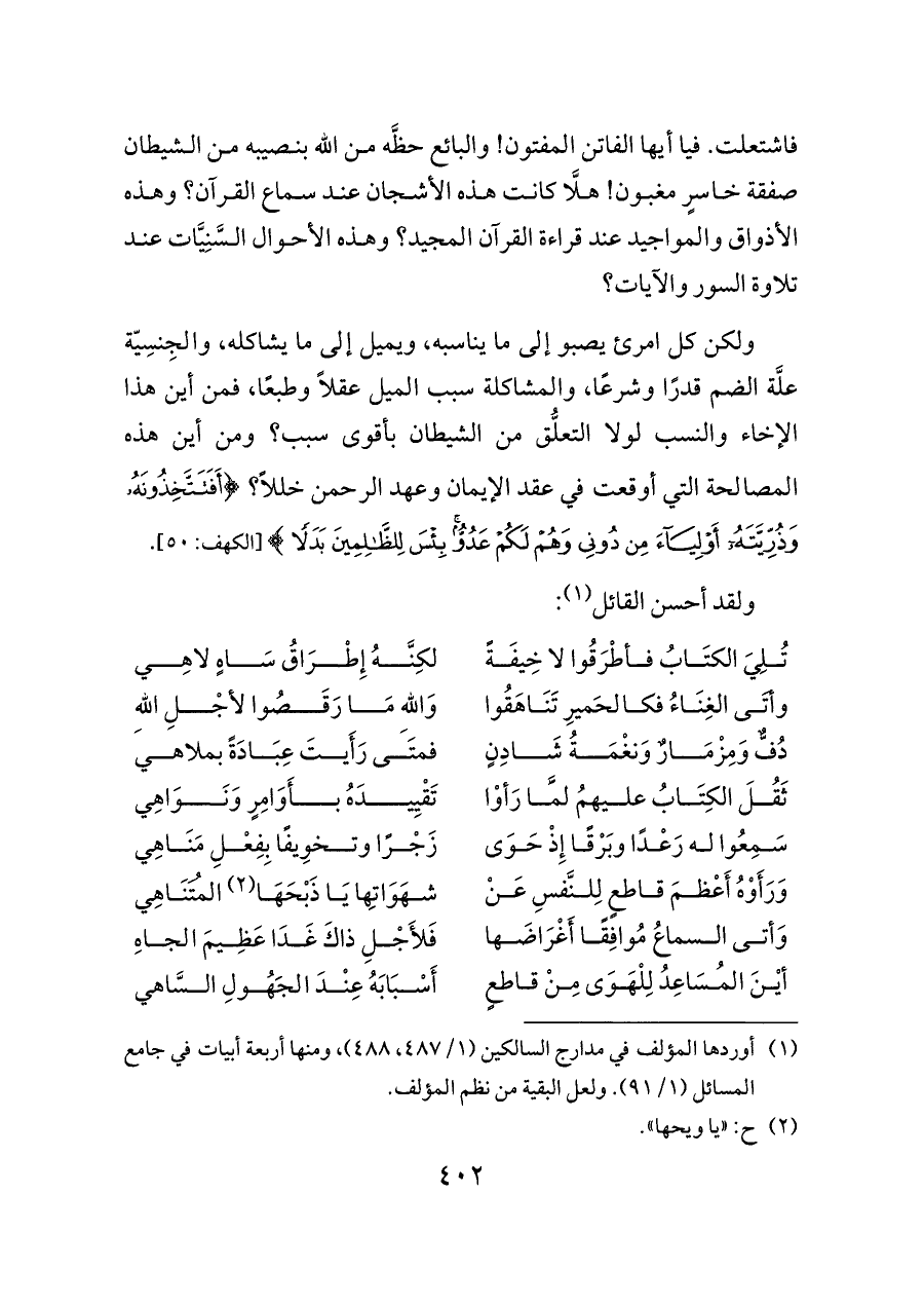 فاشتعلت. فيا أيها الفاتن المفتون! والبائع حظَّه من الله بنصيبه من الشيطان صفقة خاسرٍ مغبون! هلَّا كانت هذه الأشجان عند سماع القرآن؟ وهذه الأذواق والمواجيد عند قراءة القرآن المجيد؟ وهذه الأحوال السَّنِيَّات عند تلاوة السور والآيات؟