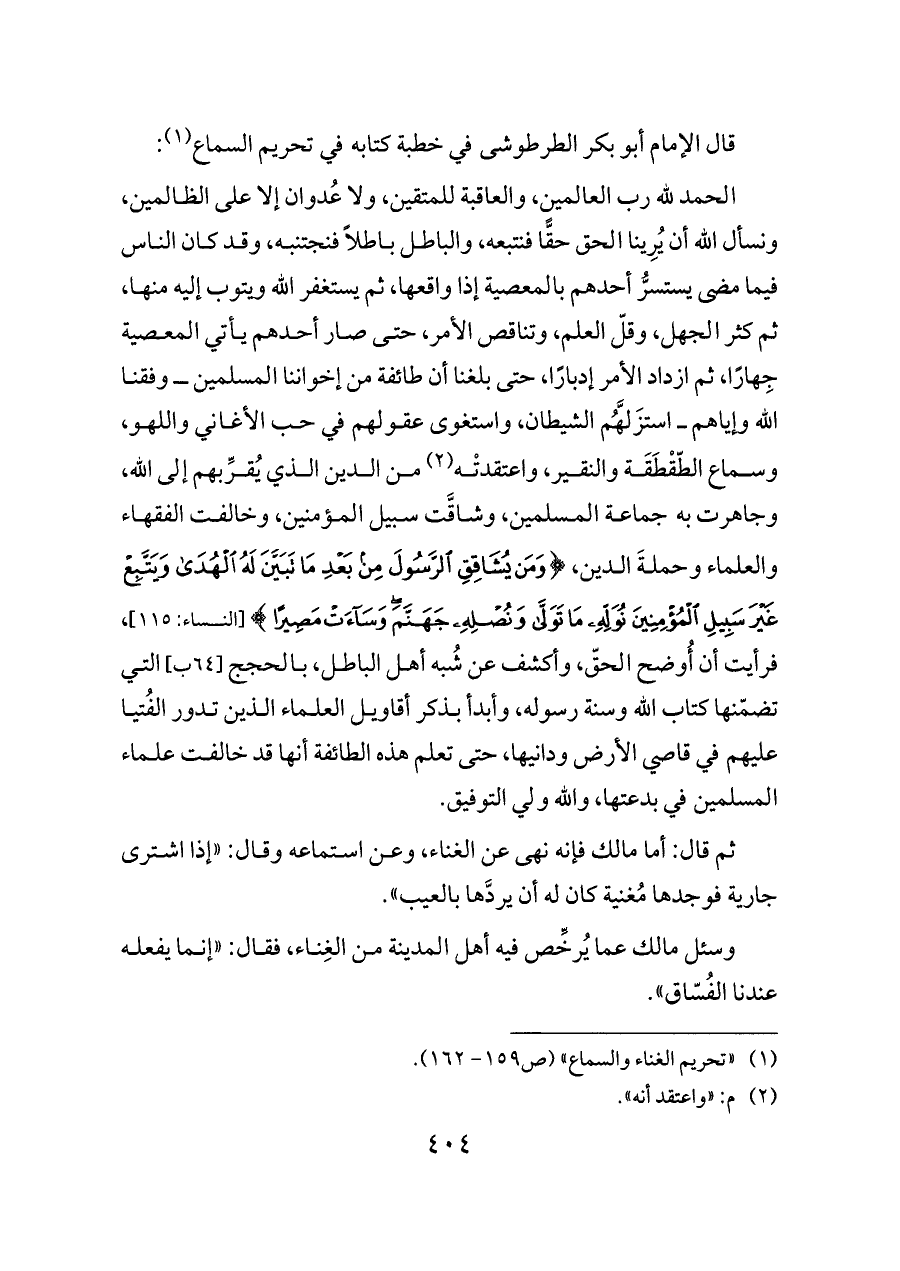 قال الإمام أبو بكر الطرطوشى في خطبة كتابه في تحريم السماع (¬١):