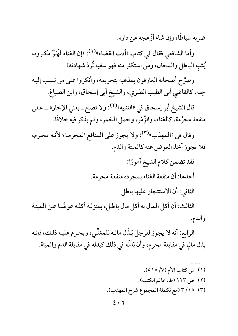 وصرَّح أصحابه العارفون بمذهبه بتحريمه، وأنكروا على من نسب إليه حِله، كالقاضي أبى الطيب الطبري، والشيخ أبى إسحاق، وابن الصباغ.