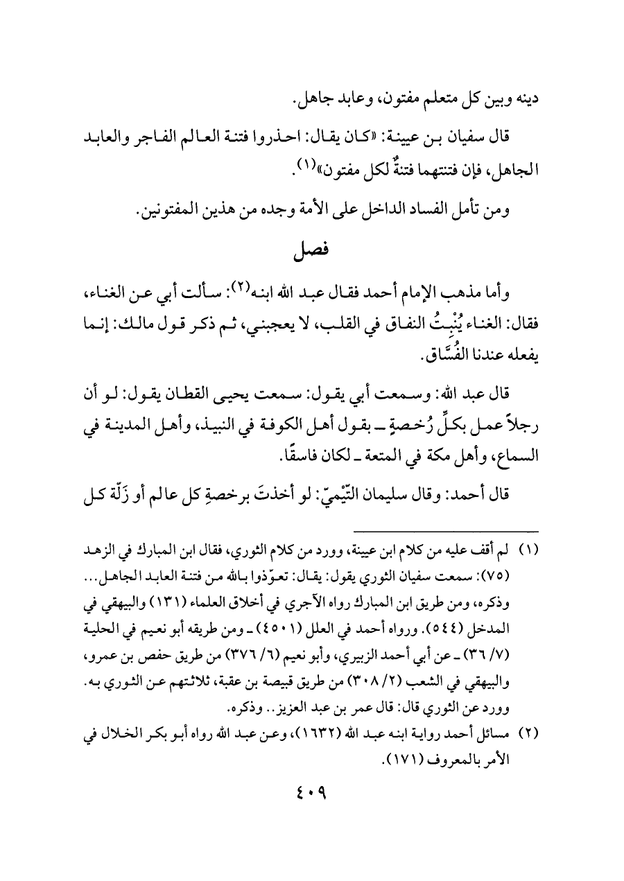 (¬١) لم أقف عليه من كلام ابن عيينة، وورد من كلام الثوري، فقال ابن المبارك في الزهد (٧٥): سمعت سفيان الثوري يقول: يقال: تعوّذوا بالله من فتنة العابد الجاهل ... وذكره، ومن طريق ابن المبارك رواه الآجري في أخلاق العلماء (١٣١) والبيهقي في المدخل (٥٤٤). ورواه أحمد في العلل (٤٥٠١) ــ ومن طريقه أبو نعيم في الحلية (٧/ ٣٦) ــ عن أبي أحمد الزبيري، وأبو نعيم (٦/ ٣٧٦) من طريق حفص بن عمرو، والبيهقي في الشعب (٢/ ٣٠٨) من طريق قبيصة بن عقبة، ثلاثتهم عن الثوري به. وورد عن الثوري قال: قال عمر بن عبد العزيز .. وذكره.