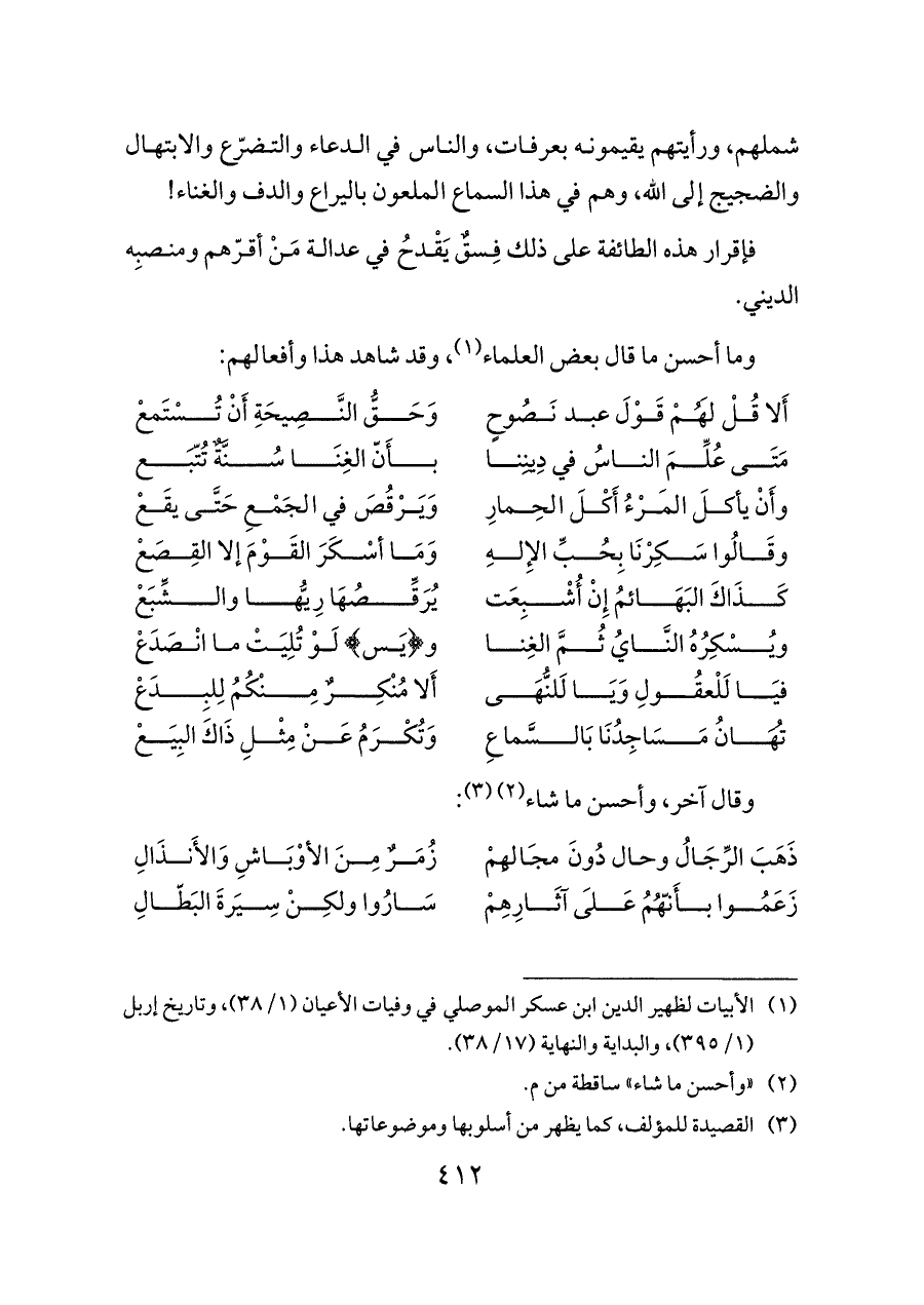 شملهم، ورأيتهم يقيمونه بعرفات، والناس في الدعاء والتضرّع والابتهال والضجيج إلى الله، وهم في هذا السماع الملعون باليراع والدف والغناء!