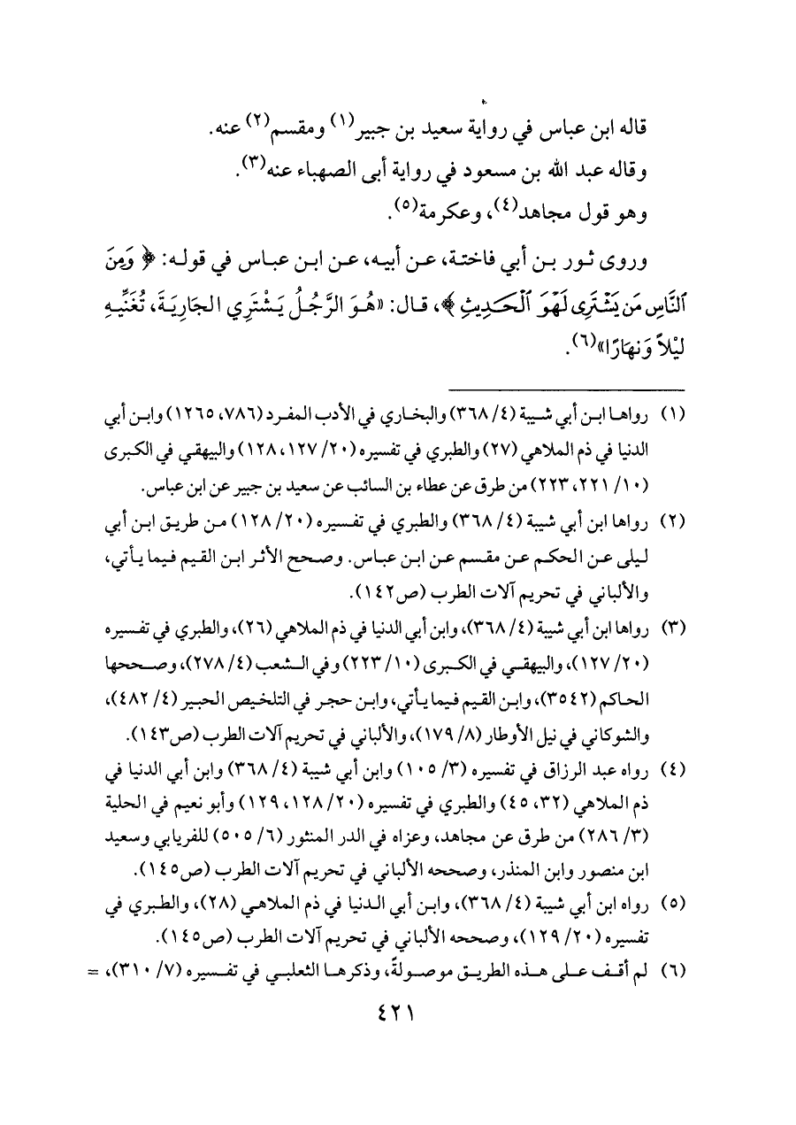 (¬٤) رواه عبد الرزاق في تفسيره (٣/ ١٠٥) وابن أبي شيبة (٤/ ٣٦٨) وابن أبي الدنيا في ذم الملاهي (٣٢، ٤٥) والطبري في تفسيره (٢٠/ ١٢٨، ١٢٩) وأبو نعيم في الحلية (٣/ ٢٨٦) من طرق عن مجاهد، وعزاه في الدر المنثور (٦/ ٥٠٥) للفريابي وسعيد ابن منصور وابن المنذر، وصححه الألباني في تحريم آلات الطرب (ص ١٤٥).