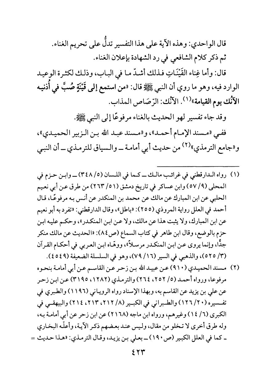 قال الواحدي: وهذه الآية على هذا التفسير تدلُّ على تحريم الغناء.