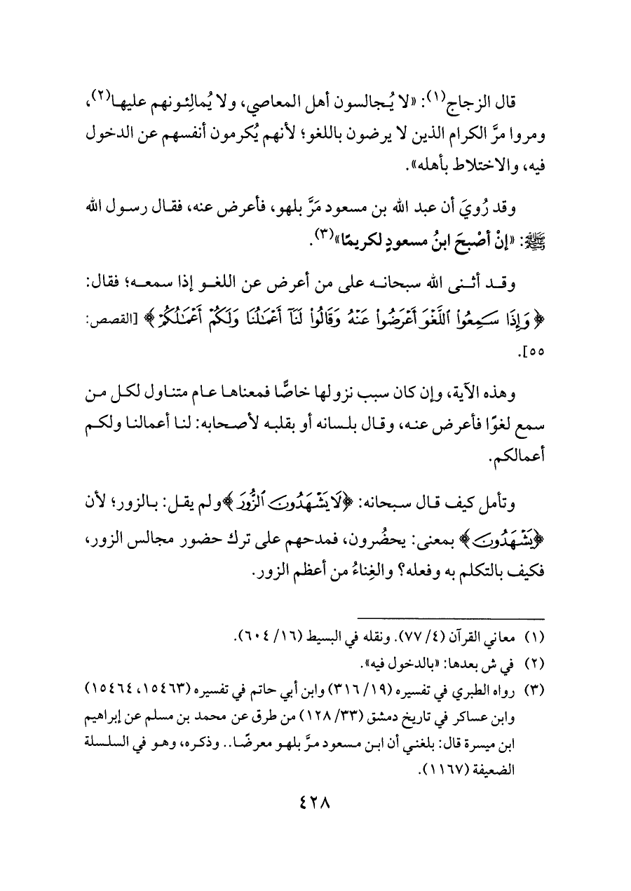 (¬٣) رواه الطبري في تفسيره (١٩/ ٣١٦) وابن أبي حاتم في تفسيره (١٥٤٦٣، ١٥٤٦٤) وابن عساكر في تاريخ دمشق (٣٣/ ١٢٨) من طرق عن محمد بن مسلم عن إبراهيم ابن ميسرة قال: بلغني أن ابن مسعود مرَّ بلهو معرضًا .. وذكره، وهو في السلسلة الضعيفة (١١٦٧).