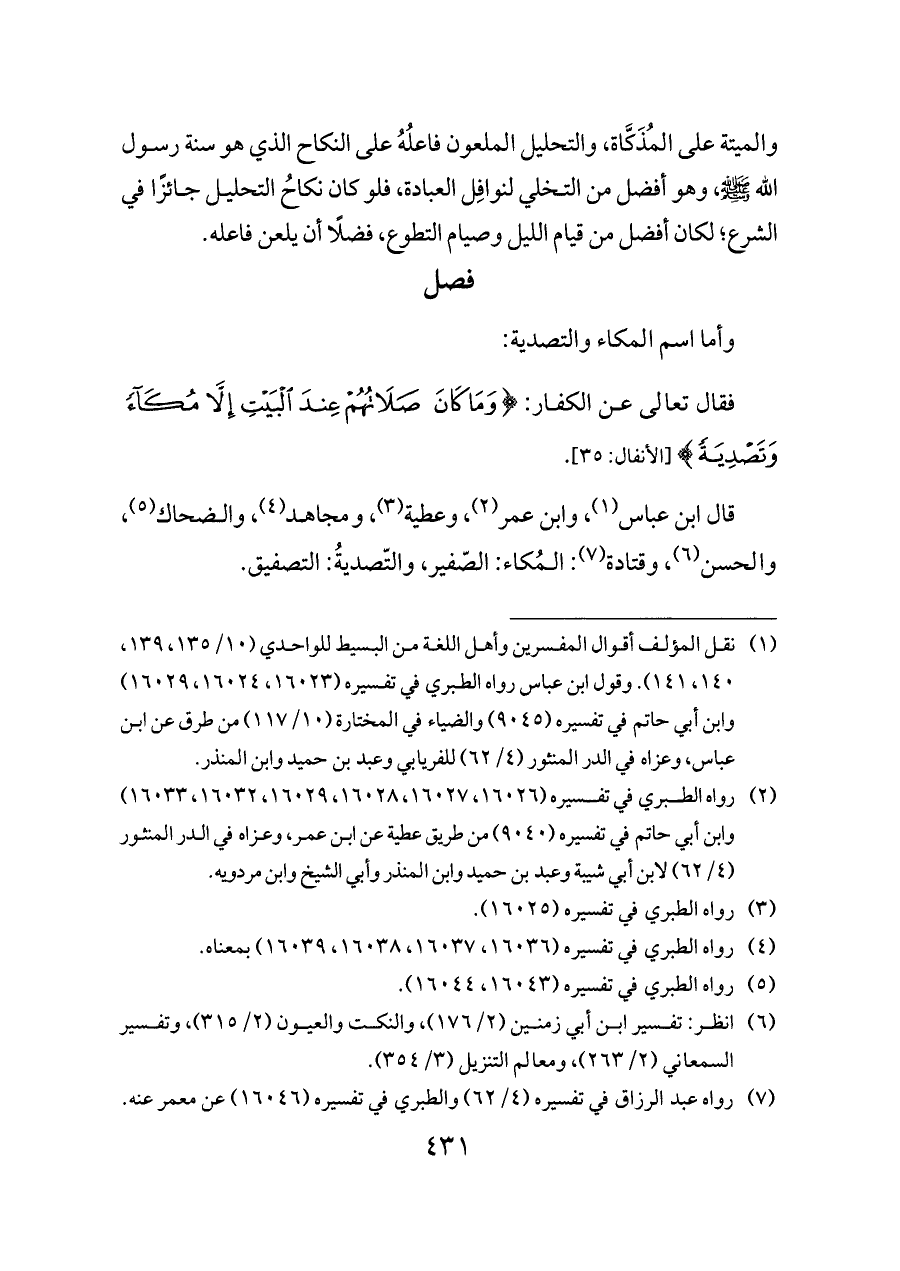 قال ابن عباس (¬١)، وابن عمر (¬٢)، وعطية (¬٣)، ومجاهد (¬٤)، والضحاك (¬٥)، والحسن (¬٦)، وقتادة (¬٧): المُكاء: الصّفير، والتّصديةُ: التصفيق.