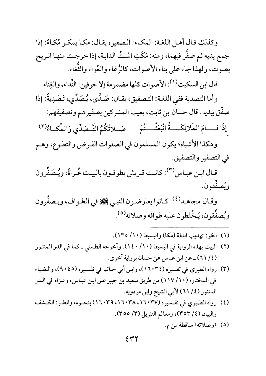 قال ابن عباس (¬٣): كانت قريش يطوفون بالبيت عُراةً، ويُصَفِّرون ويُصفِّقون.