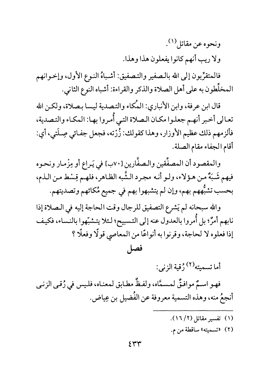 والمقصود أن المصفِّقين والصفَّارين [٧٠ ب] في يَراع أو مِزْمار ونحوه فيهم شَبَهٌ من هؤلاء، ولو أنه مجرد الشَّبه الظاهر، فلهم قِسْط من الذم، بحسب تشبُّههم بهم، وإن لم يتشبهوا بهم في جميع مُكائهم وتصديتهم.