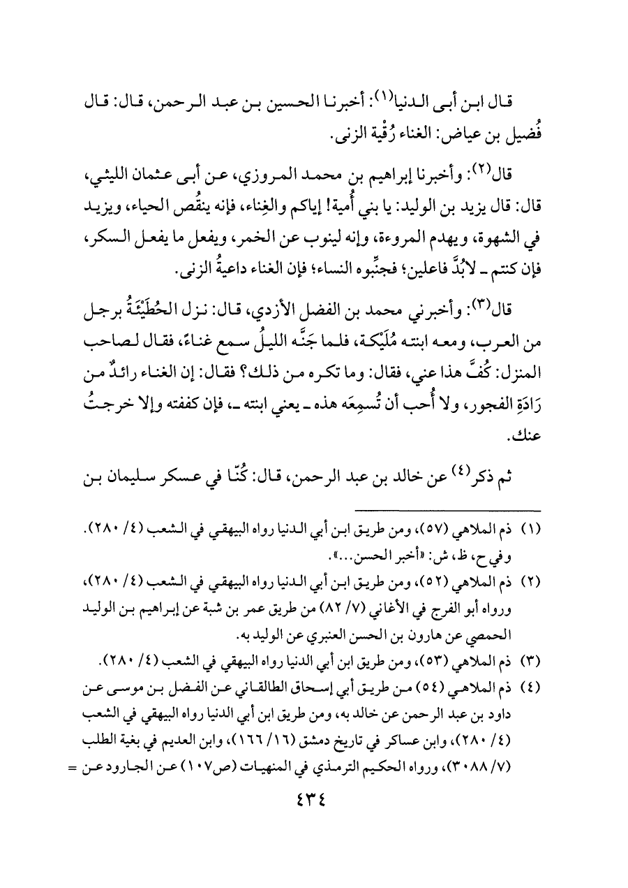 (¬٢) ذم الملاهي (٥٢)، ومن طريق ابن أبي الدنيا رواه البيهقي في الشعب (٤/ ٢٨٠)، ورواه أبو الفرج في الأغاني (٧/ ٨٢) من طريق عمر بن شبة عن إبراهيم بن الوليد الحمصي عن هارون بن الحسن العنبري عن الوليد به.