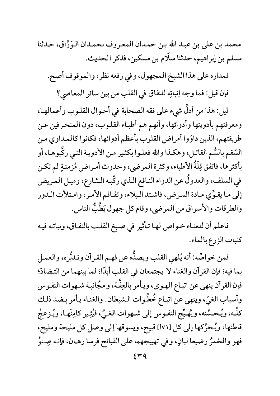 قيل: هذا من أدلِّ شيء على فقه الصحابة في أحوال القلوب وأعمالها، ومعرفتهم بأدويتها وأدوائها، وأنهم هم أطباء القلوب، دون المنحرفين عن طريقتهم، الذين داوَوا أمراض القلوب بأعظم أدوائها، فكانوا كالمداوي من السّقم بالسُّم القاتل، وهكذا والله فعلوا بكثير من الأدوية التي ركَّبوها، أو بأكثرها، فاتفق قِلّةُ الأطباء، وكثرة المرضى، وحدوث أمراض مُزمنةٍ لم تكن في السلف، والعدولُ عن الدواء النافع الذي ركّبه الشارع، وميل المريض إلى ما يقوِّي مادة المرض، فاشتد البلاء، وتفاقم الأمر، وامتلأت الدور والطرقات والأسواق من المرضى، وقام كل جهول يَطُبُّ الناس.
