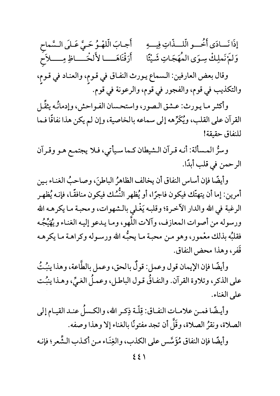 وأيضًا فإن أساس النفاق أن يخالف الظاهرُ الباطنَ، وصاحبُ الغناء بين أمرين: إما أن يتهتّك فيكون فاجرًا، أو يُظهر النُّسُك فيكون منافقًا، فإنه يُظهر الرغبة في الله والدار الآخرة؛ وقلبه يَغْلي بالشهوات، ومحبة ما يكرهه الله ورسوله من أصوات المعازف، وآلات اللَّهو، وما يدعو إليه الغناء ويُهَيِّجُه فقلبُه بذلك معْمور، وهو من محبة ما يحبُّه الله ورسوله وكراهة ما يكرهه قَفر، وهذا محض النفاق.