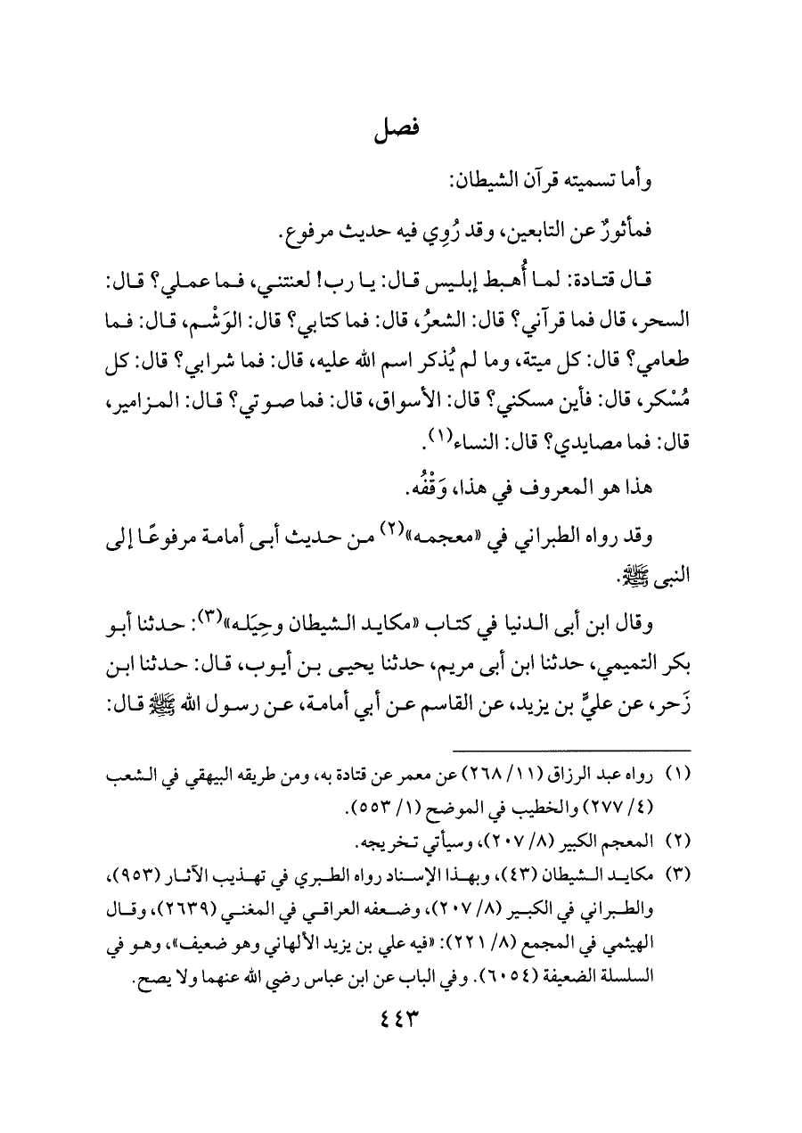 وقال ابن أبى الدنيا في كتاب «مكايد الشيطان وحِيَله» (¬٣): حدثنا أبو بكر التميمي، حدثنا ابن أبى مريم، حدثنا يحيى بن أيوب، قال: حدثنا ابن زَحر، عن عليٍّ بن يزيد، عن القاسم عن أبي أمامة، عن رسول الله - صلى الله عليه وسلم - قال: