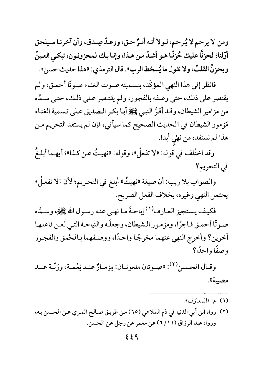 فانظر إلى هذا النهي المؤكّد، بتسميته صوت الغناء صوتًا أحمق، ولم يقتصر على ذلك، حتى وصفه بالفجور، ولم يقتصر على ذلك، حتى سمَّاه من مزامير الشيطان، وقد أقرَّ النبي - صلى الله عليه وسلم - أبا بكر الصديق على تسمية الغناء مَزمور الشيطان في الحديث الصحيح كما سيأتي، فإن لم يستفد التحريم من هذا لم نستفده من نهْيٍ أبدا.