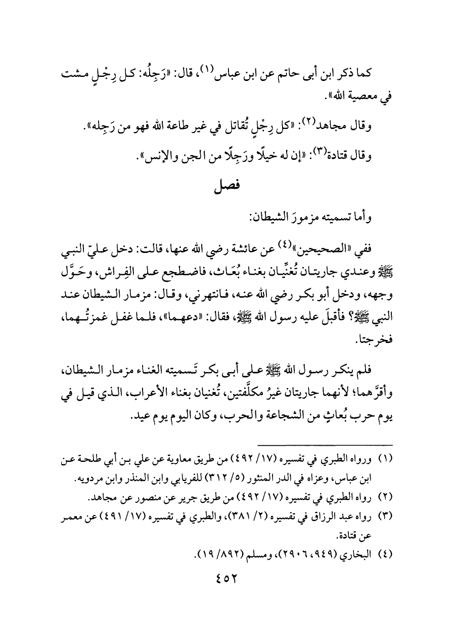 فلم ينكر رسول الله - صلى الله عليه وسلم - على أبى بكر تَسميته الغناء مزمار الشيطان، وأقرَّهما؛ لأنهما جاريتان غيرُ مكلَّفتين، تُغنيان بغناء الأعراب، الذي قيل في يوم حرب بُعاثٍ من الشجاعة والحرب، وكان اليوم يوم عيد.