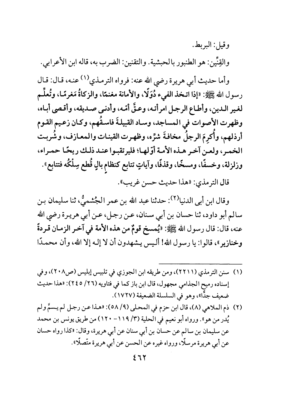 وأما حديث أبي هريرة رضي الله عنه: فرواه الترمذي (¬١) عنه، قال: قال رسول الله - صلى الله عليه وسلم -: «إذا اتخذ الفيء دُوَلًا، والأمانة مغنمًا، والزكاةُ مَغرمًا، وتُعلِّم لغير الدين، وأطاع الرجل امرأته، وعقَّ أمّه، وأدنى صديقه، وأقصى أباه، وظهرت الأصوات في المساجد، وساد القبيلةَ فاسقُهم، وكان زعيم القوم أرذلهم، وأُكرِمَ الرجلُ مخافةَ شرِّه، وظهرت القينات والمعازف، وشُربت الخمر، ولعن آخر هذه الأمة أوّلها؛ فليرتقبوا عند ذلك ريحًا حمراء، وزلزلة، وخسفًا، ومسخًا، وقذفًا، وآياتٍ تتابع كنظامٍ بالٍ قُطع سِلْكُه فتتابع».