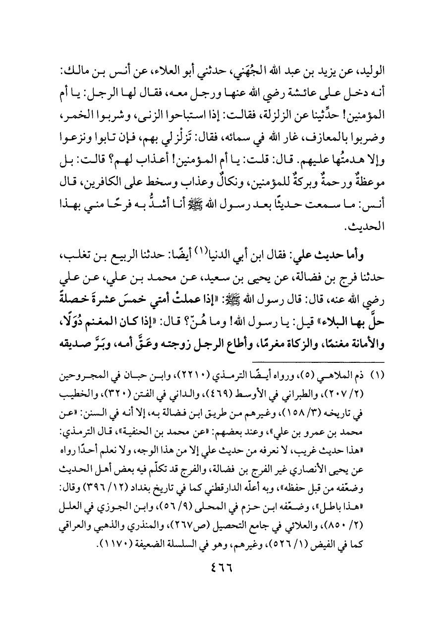 (¬١) ذم الملاهي (٥)، ورواه أيضًا الترمذي (٢٢١٠)، وابن حبان في المجروحين (٢/ ٢٠٧)، والطبراني في الأوسط (٤٦٩)، والداني في الفتن (٣٢٠)، والخطيب في تاريخه (٣/ ١٥٨)، وغيرهم من طريق ابن فضالة به، إلا أنه في السنن: «عن محمد بن عمرو بن علي»، وعند بعضهم: «عن محمد بن الحنفية»، قال الترمذي: «هذا حديث غريب، لا نعرفه من حديث علي إلا من هذا الوجه، ولا نعلم أحدًا رواه عن يحيى الأنصاري غير الفرج بن فضالة، والفرج قد تكلّم فيه بعض أهل الحديث وضعّفه من قبل حفظه»، وبه أعلّه الدارقطني كما في تاريخ بغداد (١٢/ ٣٩٦) وقال: «هذا باطل»، وضعّفه ابن حزم في المحلى (٩/ ٥٦)، وابن الجوزي في العلل (٢/ ٨٥٠)، والعلائي في جامع التحصيل (ص ٢٦٧)، والمنذري والذهبي والعراقي كما في الفيض (١/ ٥٢٦)، وغيرهم، وهو في السلسلة الضعيفة (١١٧٠).